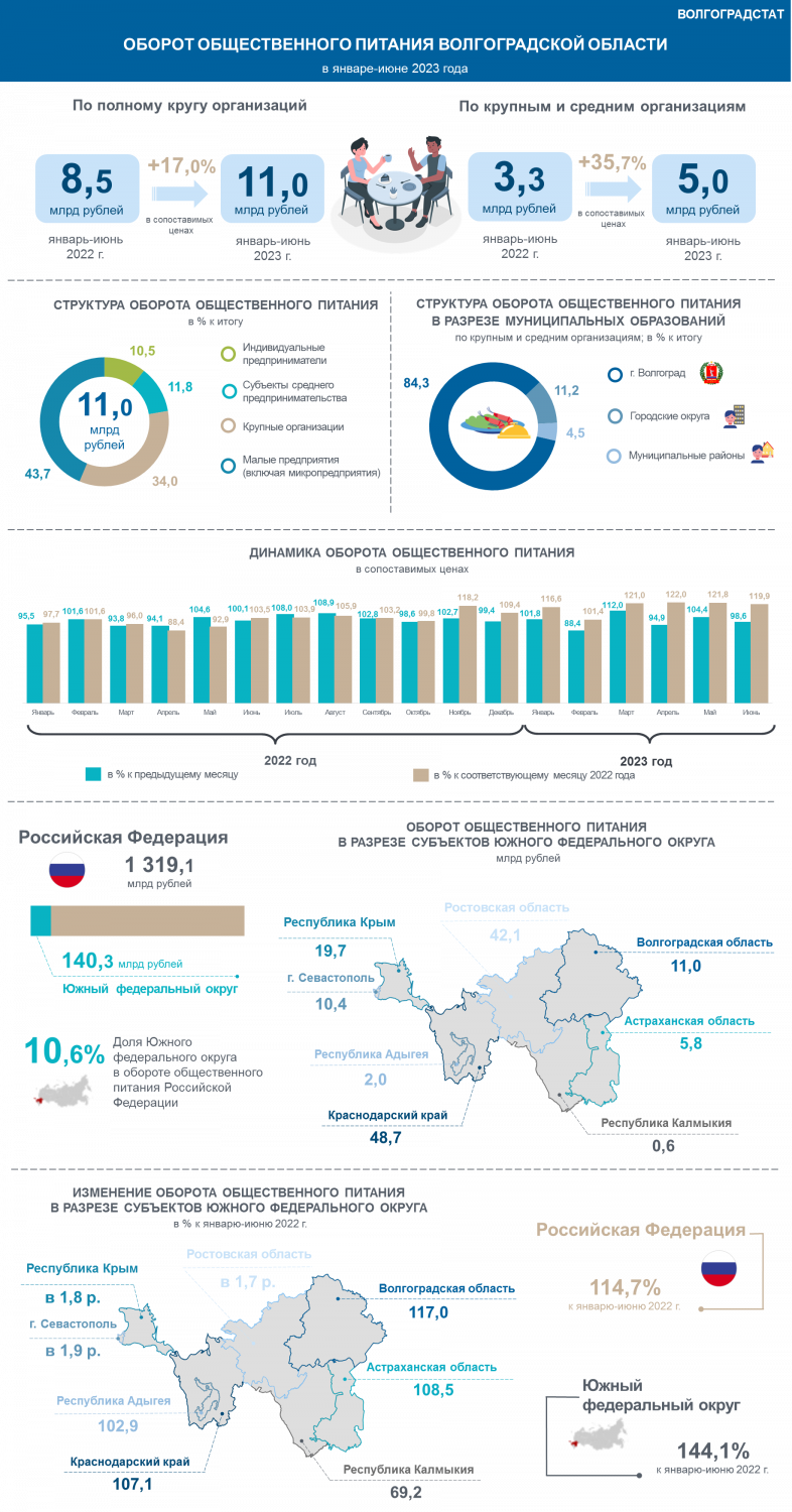 С января по июнь 2023 года оборот общественного питания Волгоградской области достиг 11 млрд рублей.