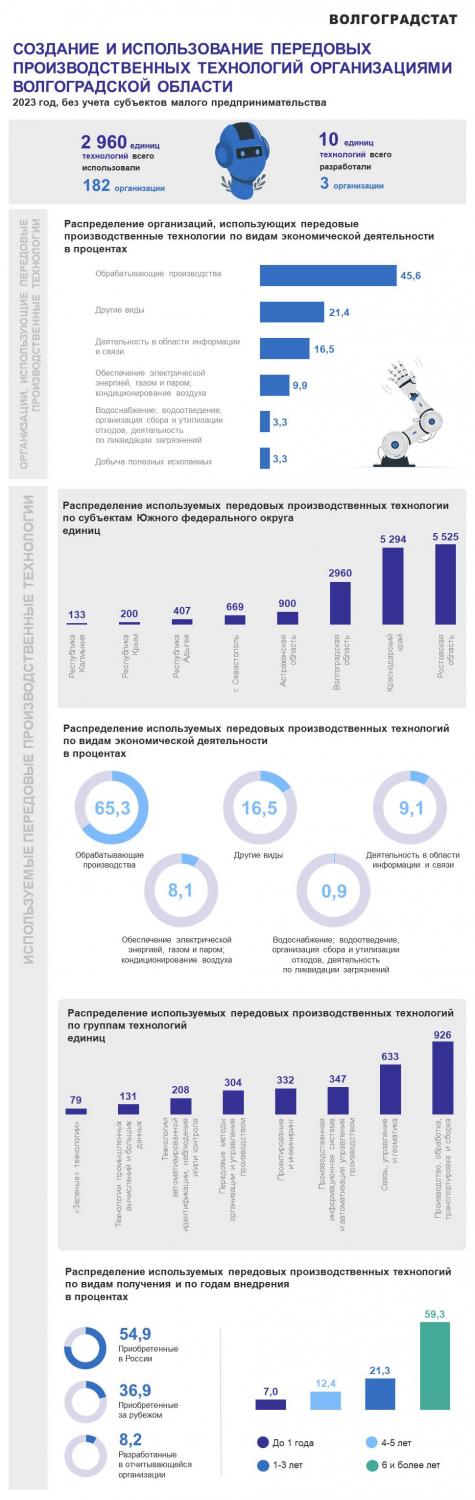 Фото: Волгоградстат. В 2023 году передовые производственные технологии применяли 182 организации в Волгоградской области, не относящиеся к субъектам малого предпринимательства.