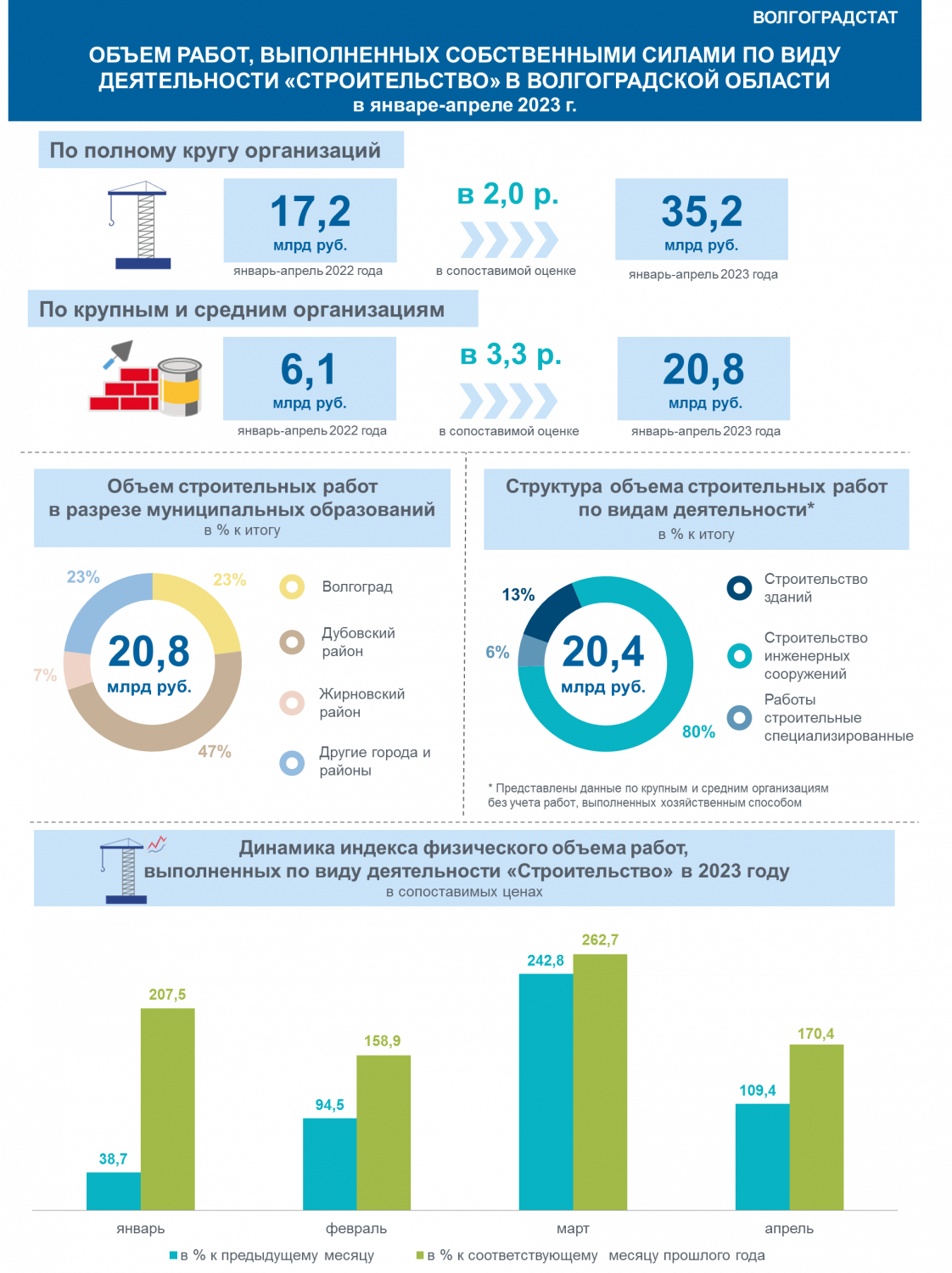 С января по апрель 2023 года в Волгоградской области строительными организациями выполнены работы на 35,2 млрд рублей. В сопоставимой оценке это в два раза выше уровня января-апреля 2022-го.