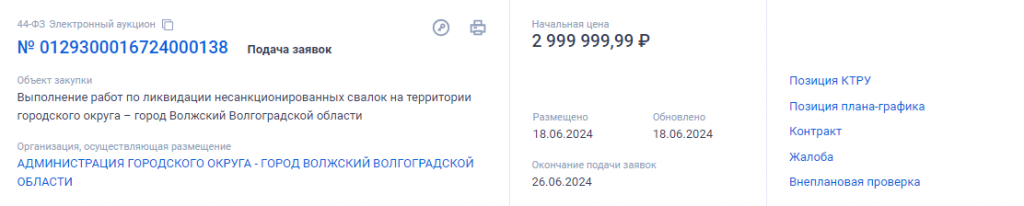 Очистка свалок будет производиться точечно по заявке заказчика. Начальная цена закупки составляет почти 3 миллиона рублей. Срок исполнения работ установлен до 30 июля.