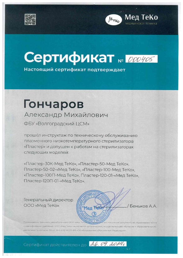 По итогам обучения Александр прошел инструктаж по техническому обслуживанию плазменного низкотемпературного стерилизатора «Пластер» и допущен к работам на стерилизаторах следующих моделей: