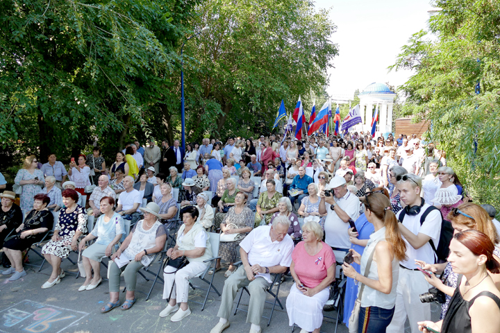 Первостроители в особом почете, поэтому праздничное мероприятие начинается с вручения юными волжанами цветов этим замечательным людям.