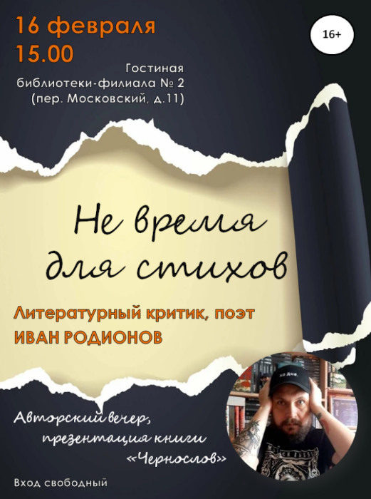 В 2024 году увидел свет его сборник стихотворений «Чернослов». Издание сборника станет одной из тем творческого вечера, автор расскажет об истории создания, своём становлении в поэтическом жанре и расставании с ним. Вечер назван «Не время для стихов», что уже вносит интригу. Возможно, выступающий даже ответит на вопрос: как можно было на старте сочетать поэтические ноты с критическими? Разговор, конечно же, коснётся современной литературы, тенденций и веяний; наверняка «всплывут» и вечные темы — кому и как творить, ниспослан ли нам этот дар свыше или трудом своим…