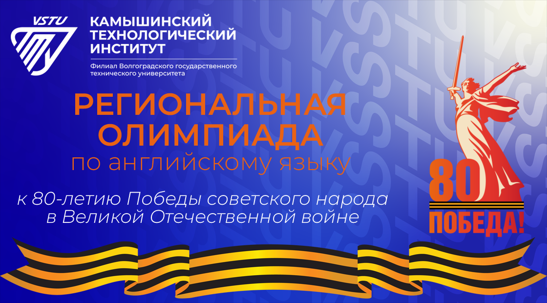 Приглашаем Вас принять участие в Региональной олимпиаде по английскому языку, приуроченной к 80-летию Победы советского народа в Великой Отечественной войне, которая состоится дистанционно с 14 апреля 2025 г. по 16 апреля 2025 г. в Камышинском технологическом институте (филиале) федерального государственного бюджетного образовательного учреждения высшего образования «Волгоградский государственный технический университет».