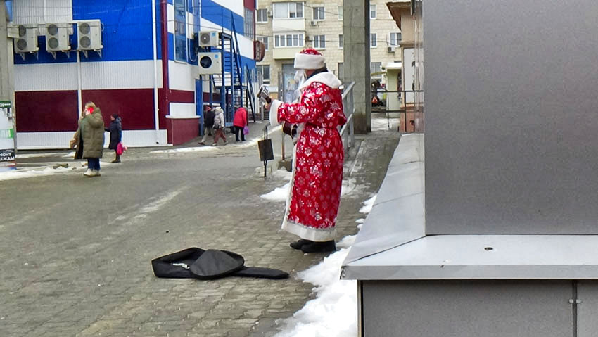 Развлекал прохожих он не совсем бескорыстно. Но камышане с улыбкой бросали какие-то монетки и даже "бумажки" в ненавязчиво приоткрытый чехол от гитары на льду. Шутники советовали "дедушке" в следующий его выход на публику прихватить на "подтанцовку" Снегурочку для завершения образа "пары дня".