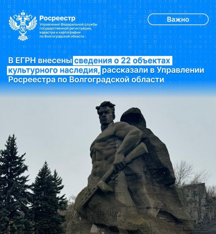 В Единый государственный реестр недвижимости внесены сведения о 22 объектах культурного наследия федерального значения, входящих в состав объекта культурного наследия федерального значения «Мемориальный комплекс «Героям Сталинградской битвы» на Мамаевом кургане».