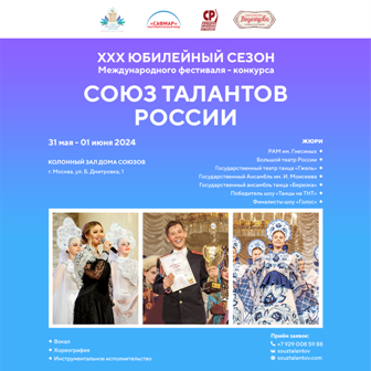 С 31 мая по 1 июня 2024 года в г. Москве в Колонном Зале Дома Союзов состоится Юбилейный ХXХ сезон Международного фестиваля музыки и танца «Союз талантов России», запланированного в рамках Международного Дня защиты детей, который пройдет по направлениям: хореография, вокал, инструментальное исполнительство.