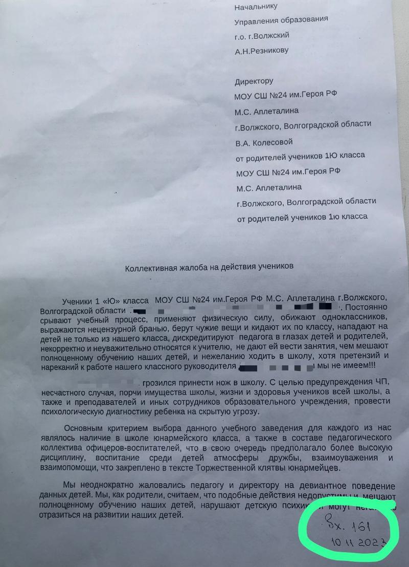 Началось все перед Новым годом, когда родители учеников 1Ю класса написали коллективную жалобу на имя начальника управления образования Волжского Резникова. В письме родители первоклашек жалуются на трех детей, которые, по их данным, « постоянно срывают учебный процесс, применяют физическую силу, обижают одноклассников, выражаются нецензурной бранью, берут чужие вещи и кидают их по классу, нападают на детей не только из нашего класса, дискредитируют педагога в глазах детей и родителей, некорректно и неуважительно относятся к учителю, не дают ей вести занятия, чем мешают полноценному обучению наших детей, и нежеланию ходить в школу, хотя претензий ».