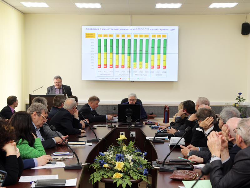 Докладчиком по первому вопросу был проректор вуза И.Л. Гоник. Игорь Леонидович говорил о качестве подготовки обучающихся по основным образовательным программам высшего образования. Проректор сразу подчеркнул, что качество подготовки обучающихся – это вопрос многоплановый. Докладчик остановился на позициях ВолгГТУ по направлению «Образование» в таких рейтингах, как RUR, QS EECA, «Эксперт РА», НРУ «Интерфакс». И было отмечено, что позиции у опорного университета весьма достойные и это очень важно, поскольку это оценка работы вуза внешними независимыми экспертами. Еще один важный показатель – удовлетворенность работодателей и студентов качеством подготовки студентов, выбором вуза и направлениями подготовки. Работодатели не могут быть недовольны качеством подготовки политехников, потому что подтверждение этого качества – огромное количество дипломов с отличием и таких дипломов с каждым годом все больше. Напоминал И.Л. Гоник о профессионально-общественной аккредитации образовательных программ ВолгГТУ, которая состоялась осенью 2022 года. 27 программ, из них по срокам действия аккредитаций: 4 года – 6, 5 лет – 18 и 6 лет – 3. Говорил Игорь Леонидович и о работе с задолженностями студентов, об отчислении самых нерадивых. Присутствовавший на заседании ректората президент ВолгГТУ академик РАН Иван Александрович Новаков отмечал, что нет системной работы с такими студентами. «Нужны предложения по улучшению такой работы!» – подчеркнул И.А. Новаков. С президентом вуза был согласен и О.В. Душко. «Необходимо искать новые подходы, потому что и жизнь новая, и студенты новые», – заметил директор ИАиС. С мест также звучало много предложений об улучшении работы в этом направлении, в частности, было предложено, чтобы кураторы работали до конца обучения, от них очень много зависит.