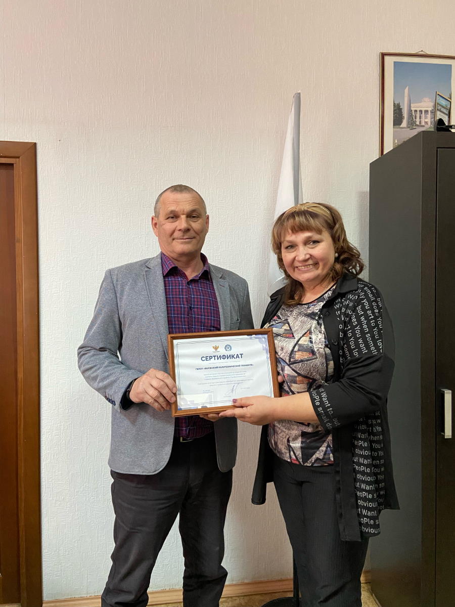 Сегодня администрации нашего техникума в лице директора Саяпина С.П. и заместителя директора по воспитательной работе Андреевой Л.Н. был вручен Сертификат активного участия в конкурсе на создание гимна системы среднего профессионального образования в рамках федерального проекта «Профессионалитет» от ФГБОУ ДПО ИРПО.