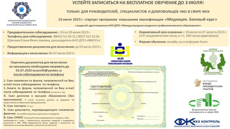 Обучение организовано АНО ДПО «Международная академия профессионального образования» (г.Волгоград) при поддержке Фонда президентских грантов в рамках проекта «Межрегиональный центр компетенций НКО и жителей МКД в сфере ЖКХ».