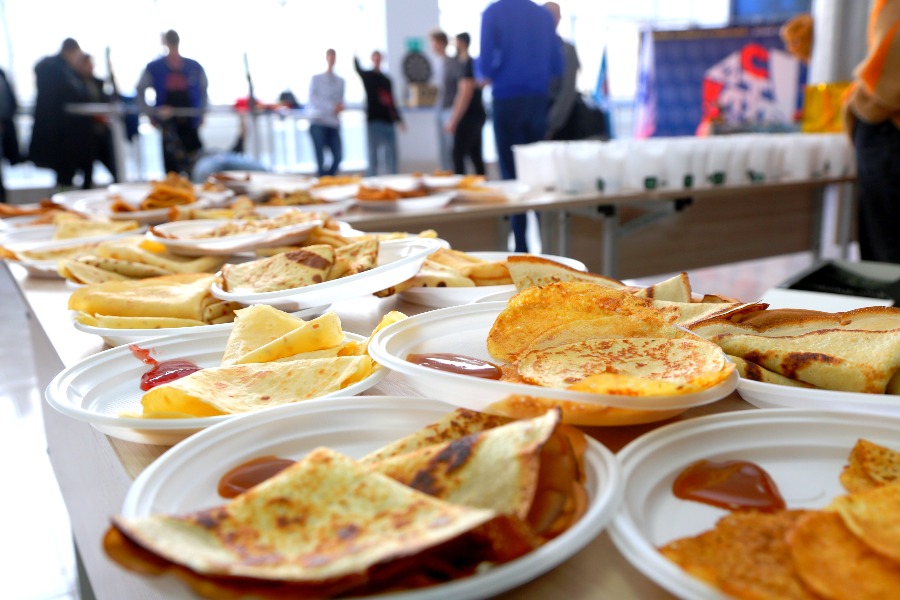 Студенты Волгоградского государственного технического университета лакомились блинами с джемом и состязались в жиме лежа и дартсе на втором этаже высотного корпуса. Там же устроили состязания по перетягиванию каната.