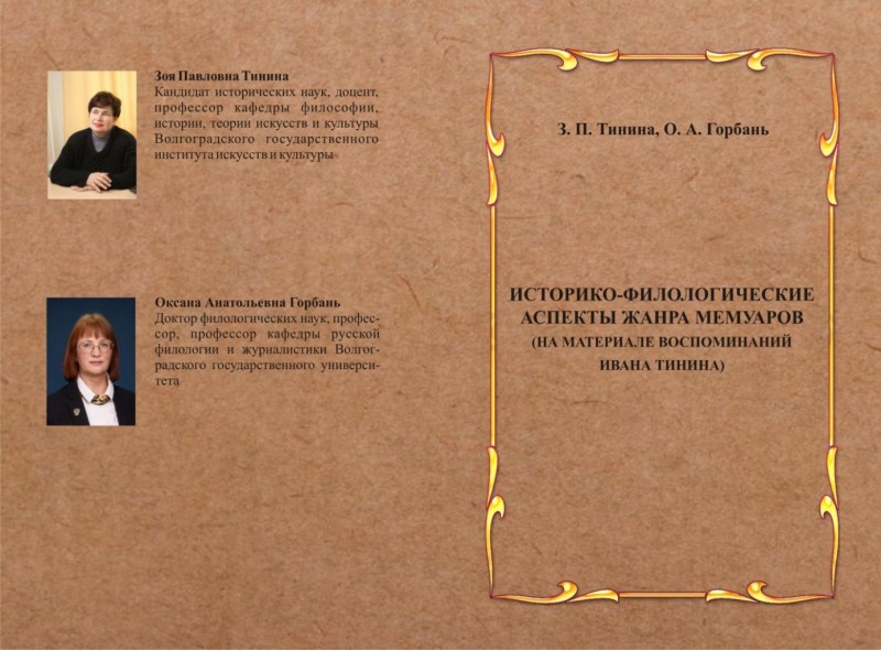 Вышла в свет монография, выполненная доктором филологических наук О. А. Горбань и кандидатом исторических наук З. П. Тининой. Рецензент О.И.Луконина, доктор искусствоведения, профессор, академик РАЕН, и.о.ректора ВГИИК: « Предлагаемая читателю монография, приуроченная к 100-летию со дня рождения известного волгоградского историка, деятеля культуры, просветителя Ивана Григорьевича Тинина, посвящена изучению его воспоминаний как исторического и лингвистического источника. Она выполнена доктором филологических наук О. А. Горбань и кандидатом исторических наук З. П. Тининой.