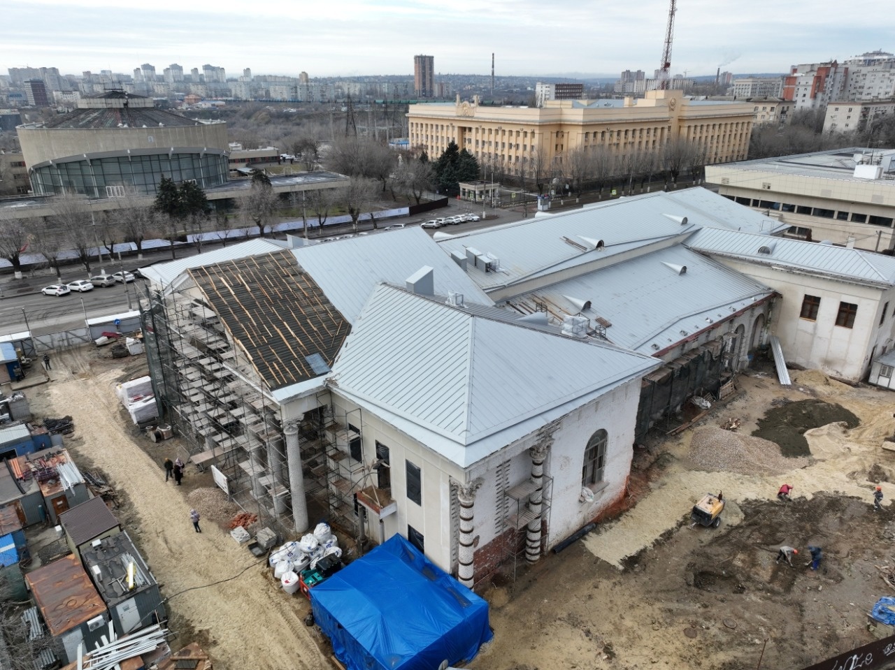 Специалисты подрядной организации уже выполнили бетонирование перекрытий зрительного зала и административно-бытового комплекса, монолитных балок колоннады центрального входа, усилили проемы вестибюля, возвели перегородки, подвели наружные инженерные сети, подняли кирпичные стены пристройки.