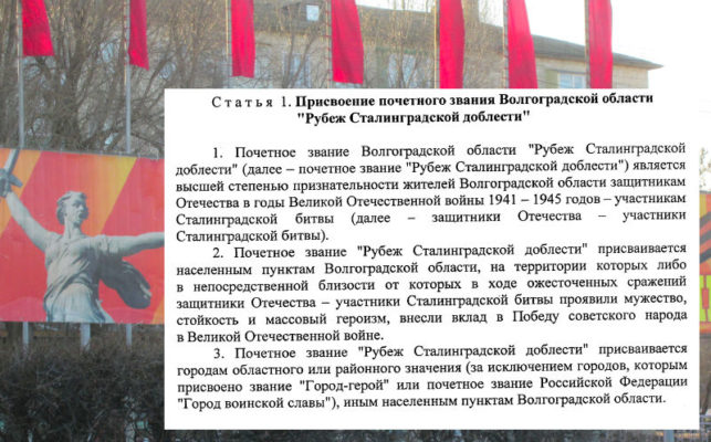 На уходящей неделе, 16 февраля, Волгоградской областной Думой был принят соответствующий закон. В нём прописано, что почетное звание «Рубеж Сталинградской доблести» будет присваиваться населенным пунктам региона, на территории которых в ходе ожесточенных боев советские воины проявили мужество, стойкость и массовый героизм.