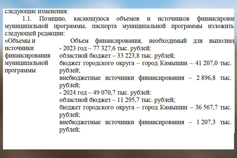 Глава Камышина подписал очередные изменения в постановление об исполнении муниципальной программы «Благоустройство территории городского округа — город Камышин». Подчеркнём, что обозначенное в документе финансирование может быть изменено в последующих коррективах, но на данный момент налицо сокращение затрат на столь важную сферу в 2024 году.