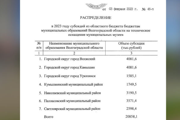 Губернатором Волгоградской области Андреем Бочаровым подписано постановление об утверждении распределения в 2023 году субсидий из областного бюджета на техническое оснащение музеев.