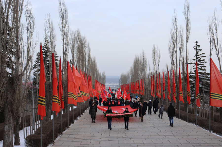 У подножия Мамаева кургана было развернуто 6-метровое полотно Знамени Победы. Его пронесли по всем 200 ступеням, по количеству дней жесточайшей битвы в современной истории. Сталинградские коммунисты возложили венки и алые гвоздики в Пантеоне Славы.
