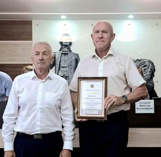 На снимке: спикер Камышинской городской думы Владимир Пономарев со спикером Волгоградской областной думы Александром Блошкиным 14 июля: наша дума заняла третье место среди представительных собраний городский округов и получает диплом премии за отличную работу