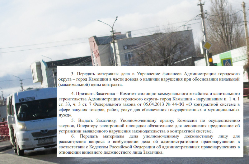 Один из перевозчиков подал жалобу в Федеральную антимонопольную службу Волгоградской области. Жалоба была рассмотрена. Её доводы в отношении требований к транспортным средствам были признаны необоснованными. Что же касается довода о возможном нарушении обоснования начальной (максимальной) цены контракта, то ФАС передал рассмотрение этого вопроса в Управление финансов администрации Камышина, как органу осуществляющему контроль за распределением бюджетных средств. Также в рамках проведения внеплановой проверки по жалобе комиссия установила, что извещение о проведении закупки содержит противоречивую информацию о требованиях в отношении транспортных средств, необходимых для исполнения работ.