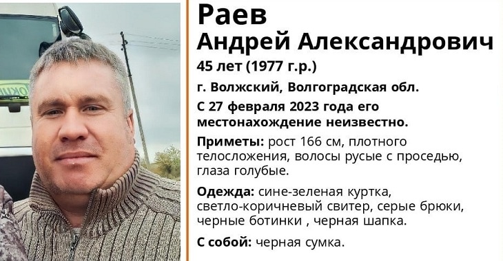 45-летний житель Волжского пропал 27 февраля и с тех пор о нем ничего не известно. Как сообщили ИА «Высота 102» волонтеры движения «Лиза Алерт», Андрей Раев был одет в сине-зеленую куртку, светло-коричневый свитер, серые брюки, черные ботинки и черную шапку.