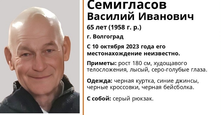 В Волгограде волонтеры приступили к поискам 65-летнего Василия Семигласова, который бесследно исчез 10 октября. Об этом сообщили V102.RU в группе «Лиза Алерт».
