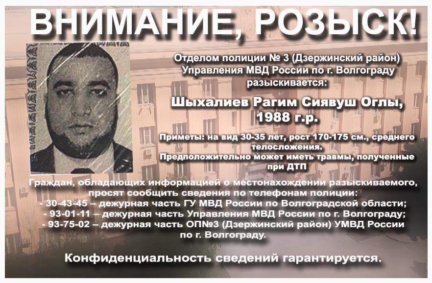 По информации от ГУ МВД России по Волгоградской области, 35-летний Шыхалиев Рагим Сиявуш Оглы сбежал после произошедшего ДТП ночью 30 сентября. Водитель находился за рулем автомобиля “Мерседес Бенц” и столкнулся с автомашиной “Кайви” на пересечении улицы Продольной и улицы Р.Корсакова. В результате аварии погибли водитель и его пассажир-ровесник.