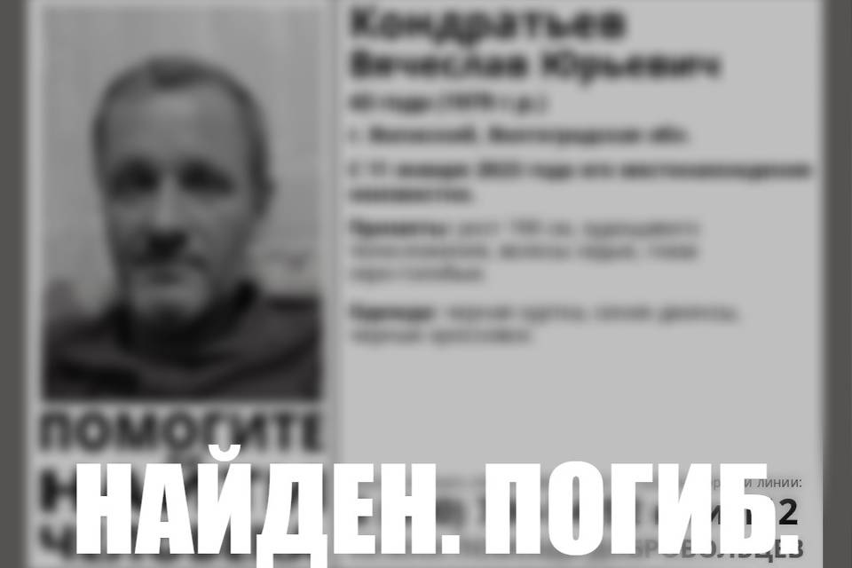 Исчезнувший 11 января текущего года 43-летний волжанин Вячеслав Кондратьев был найден накануне погибшим, в связи с чем поиски прекращены. ЧП подтвердили "Городским вестям" также в пресс-службе Управления МВД России по городу Волжскому.