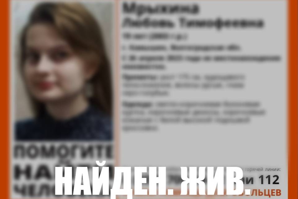 Ранее телеканал «Волгоград1» сообщал, что в Камышине Волгоградской области ищут 19-летнюю Любовь Мрыхину, которая ушла из дома 26 апреля и после этого о ее местонахождении ничего не было известно. Знакомые рассуждали, что ей не было смысла сбегать, так как жила девушка одна, ее молодой человек находится в зоне СВО.