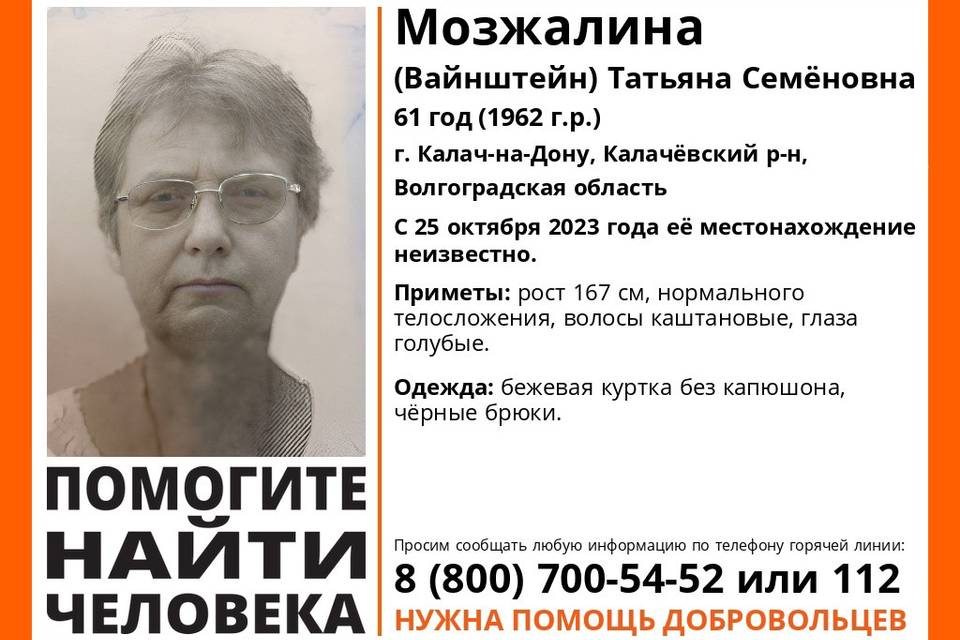 В Волгоградской области бесследно исчезла Татьяна Семеновна Мозжалина (Вайнштейн).