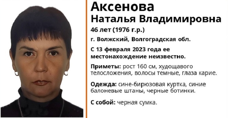 Под Волгоградом разыскивают 46-летнюю женщину, которая пропала 13 февраля. Как сообщили ИА «Высота 102» активисты движения «Лиза Алерт», 46-летняя Наталья Аксенова пропала в Волжском.