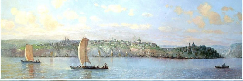Постскриптум. Так что же видим на картине? В основном, церкви как доминанты пространства того времени. На бывшем островке, при впадении в Волгу реки Камышинки (край справа) возвышается Троицкий собор. Если перемещать взгляд левее, то мы видим Дмитриевскую церковь, а следом Успенскую. Наконец, за парусом лодки, вдали едва заметными очертаниями показана Никольская приклабищенская церковь. Тот самый Никольский кафедральный собор, который сохранился до наших дней!