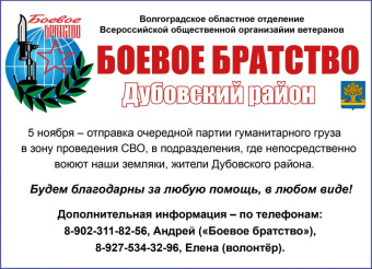 Дубовское отделение Всероссийской общественной организации ветеранов боевых действий «Боевое братство» и инициативная группа волонтеров, участвующих в подготовке и отправке помощи ребятам просит вас, уважаемые земляки, не оставаться в стороне и оказать посильную помощь.