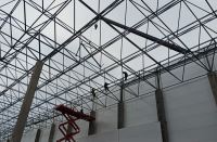 Ранее рабочие подвели коммуникации, смонтировали каркас здания из стальных опор и стены из современных композиционных материалов. В настоящее время специалисты из металлопрофиля собирают несущую конструкцию крыши, и приступают к монтажу кровельного покрытия из мембранного материала. Мембрана, собранная из нескольких слоев высокотехнологичных полимерных материалов, отличается высокой водостойкостью и долговечностью. Также она обладает малым весом и, соответственно, создает минимальную нагрузку на несущие конструкции здания. Данная технология также отличается высокой устойчивостью к перепадам температур. В работах на объекте задействованы порядка 50 человек и 12 единиц спецтехники.