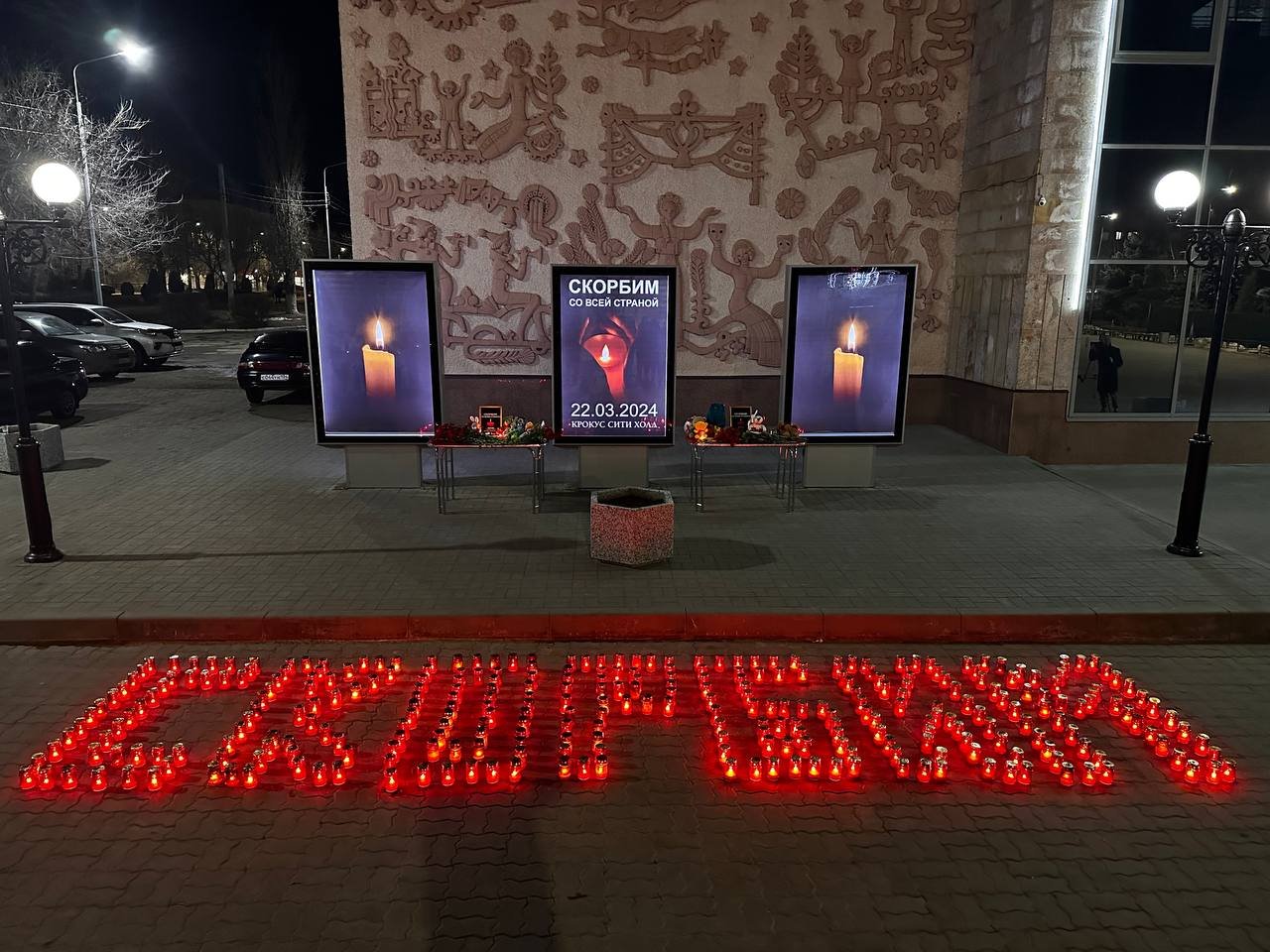В Камышине возле ДК "Текстильщик" в память о погибших во время теракта в подмосковном "Крокус Сити Холле" 22 марта, зажгли свечи.