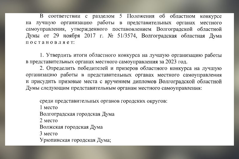 Среди городских округов призовые места распределились следующим образом: I место — Волгоградская городская дума, II место — Волжская городская дума и III место — Урюпинская городская дума. Камышинскую городскую думу предлагается «наградить дипломами Волгоградской областной Думы «За активное участие в конкурсе».
