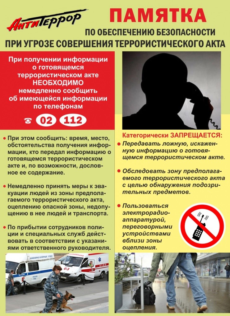 При получении информации о готовящемся теракте необходимо немедленно сообщить об имеющейся информации по тел.: 02 или 112.