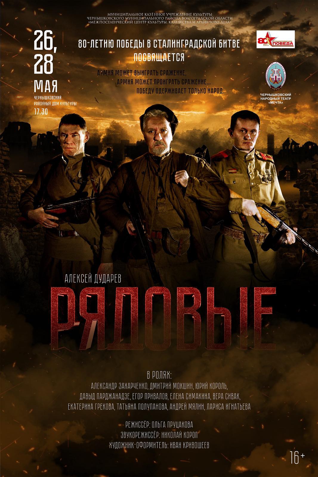 Чернышковский народный театр «Мечта» приглашает вас на премьеру спектакля «Рядовые» по пьесе А. Дударева, которая состоится 26 и 28 мая в киноконцертном зале районного Дома культуры.