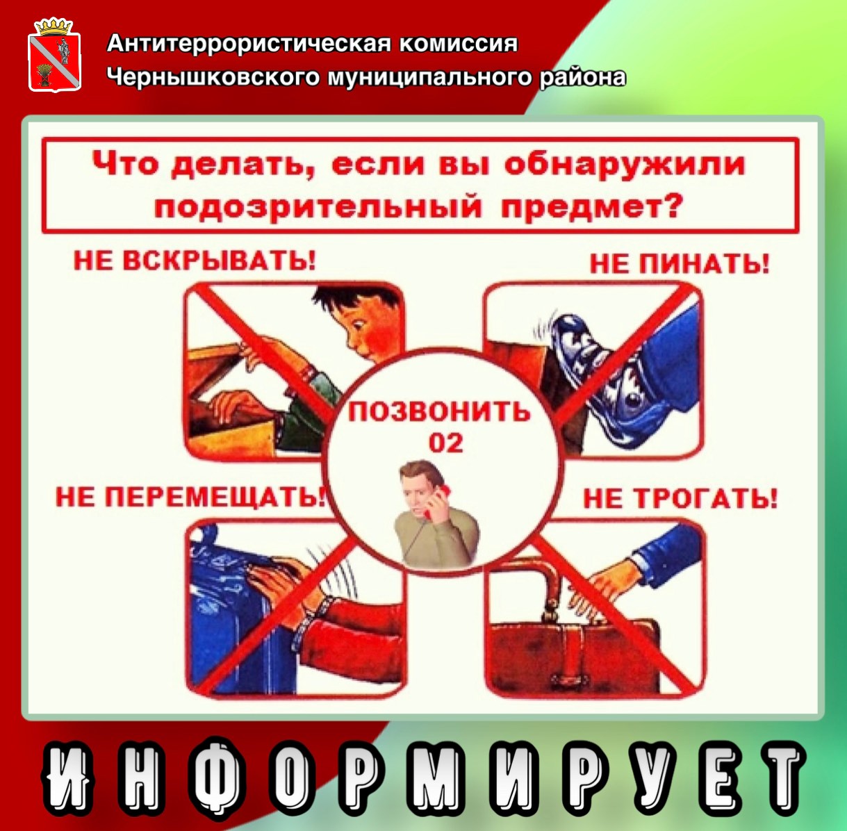 До прибытия сотрудников спецслужб не трогайте неустановленные предметы и не вступайте в контакт с подозрительными лицами.