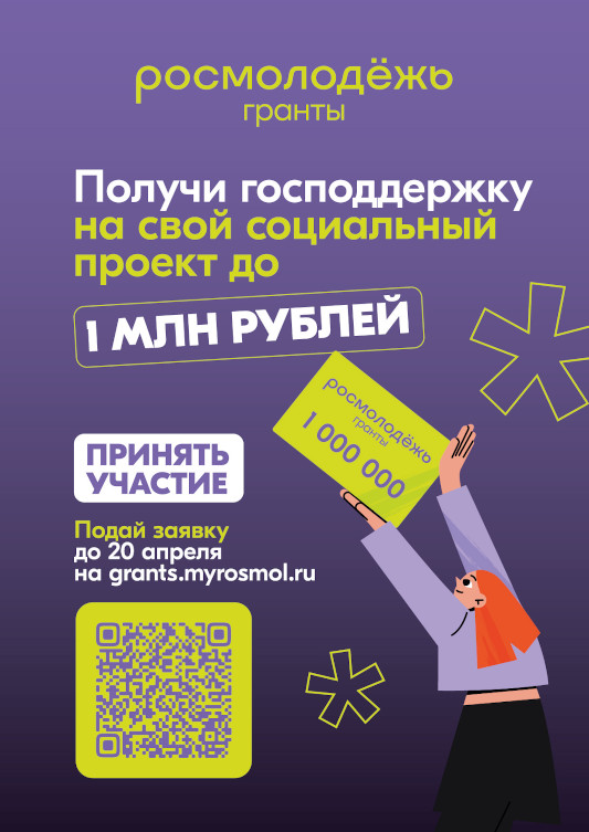 Росмолодёжь запустила первый грантовый конкурс для физических лиц в этом году. Приём заявок на Росмолодёжь.Гранты завершится 20 апреля. Заполнить и отправить проектную заявку можно в ФГАИС «Молодёжь России».