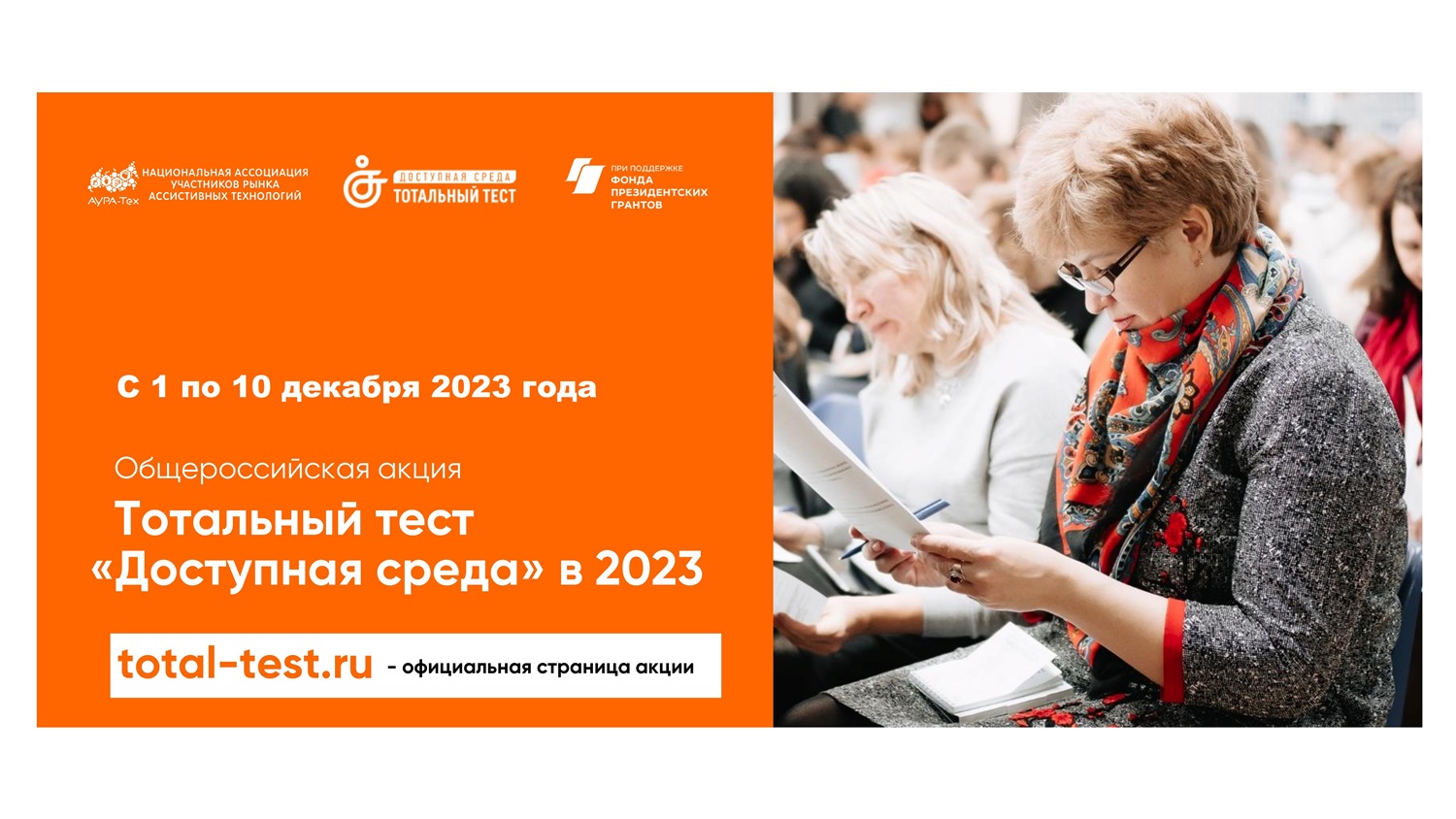 С 1 по 10 декабря 2023 года в 10:00 на сайте https://total-test.ru/ по московскому времени состоится ежегодная Общероссийская акция Тотальный тест «Доступная среда».