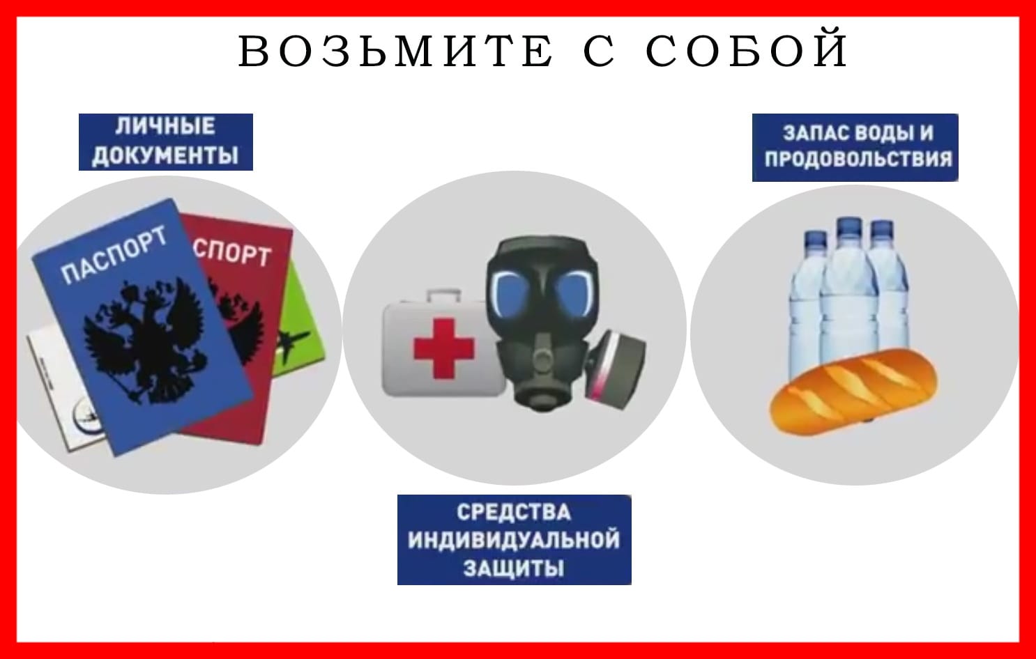 – взять с собой «тревожный чемоданчик»: в нем должны находиться документы, деньги, аптечка первой помощи и необходимые (индивидуальные) для вас лекарства; фонарик и запас батареек, спички, перочинный (универсальный) нож, нитки, иголки, ножницы; средства связи с зарядными устройствами и сменными элементами питания. Также необходимо взять с собой запас воды (не менее 1,5 литра) и запас продуктов на трое суток (сухари, консервы), посуду (тарелку, ложку, кружку), средства личной гигиены (влажные салфетки, пакеты для мусора);