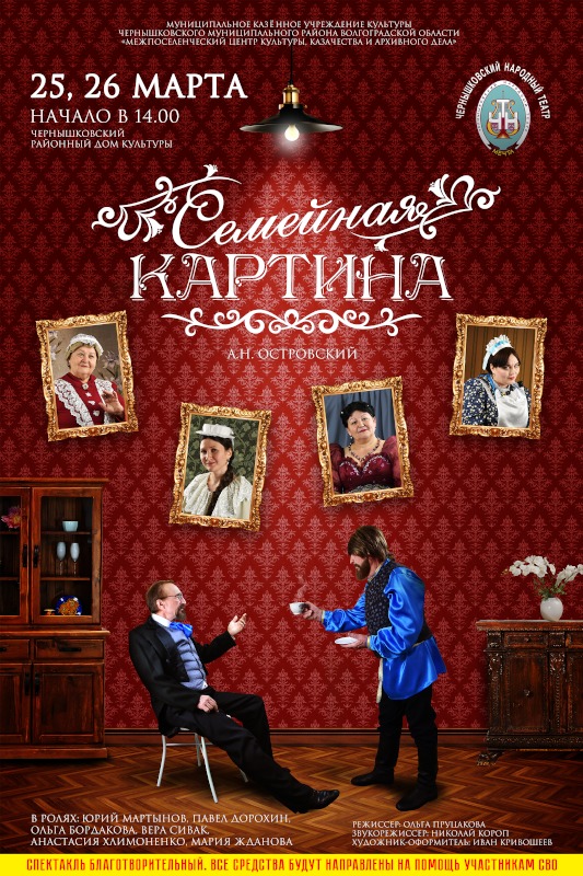 Уважаемые жители и гости района! В субботу и воскресенье, 25 и 26 марта, в 14:00 Чернышковский народный театр «Мечта» приглашает вас на премьеру спектакля «Семейная картина» по пьесе А.Н. Островского.
