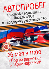 Приглашаем всех желающих жителей и гостей города Фролово принять участие в автопробеге, посвященном в честь 78-й годовщины Победы в ВОв и поддержку участников СВО.