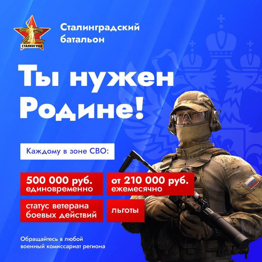 Записаться в «Сталинградский батальон» можно в пункте отбора по адресу г. Волгоград, ул. Советская, 25, в военных комиссариатах по месту жительства, в администрациях муниципальных районов и городских округов региона.