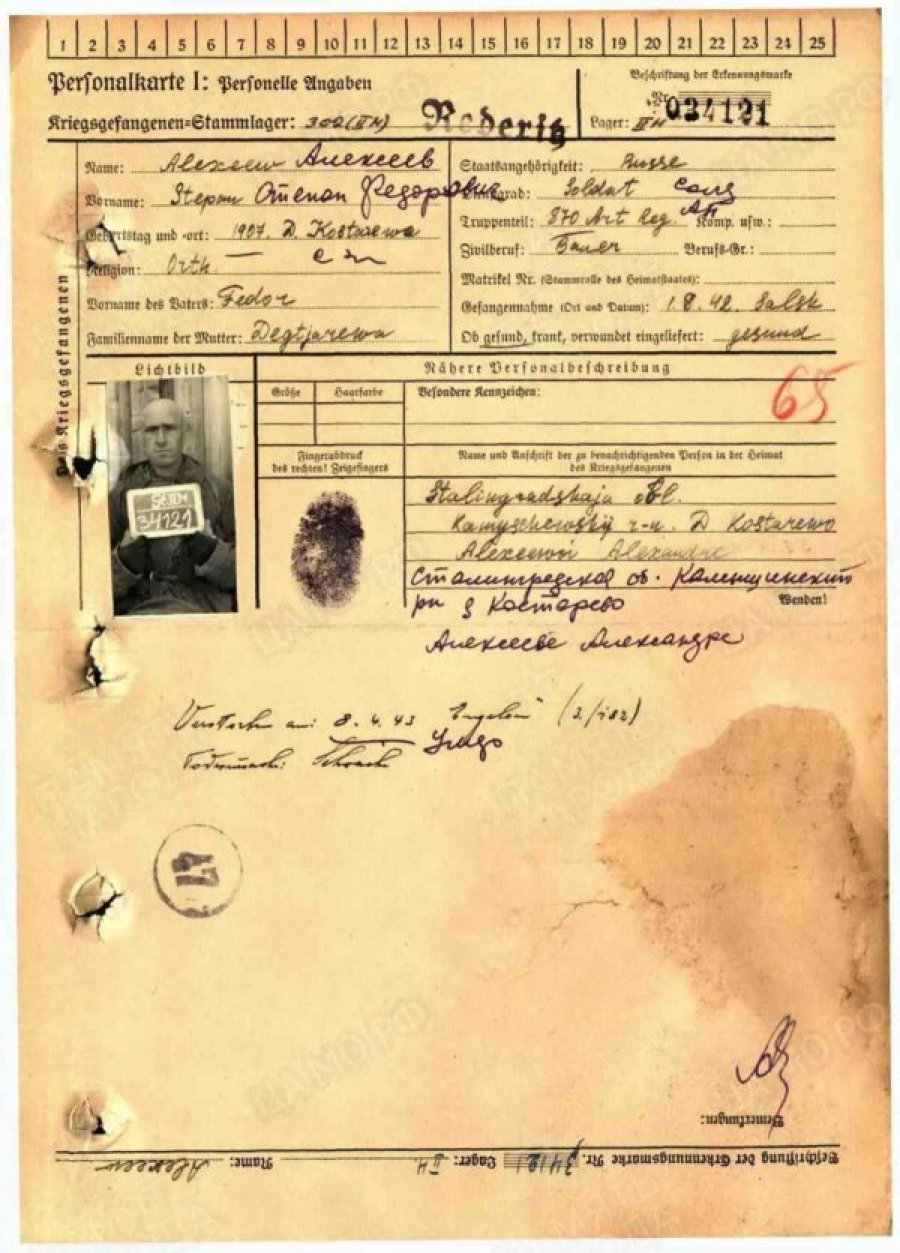 Идёт поиск родственников Алексеева Степана Фёдоровича 1907\1909 года рождения. Жена — Алексеева Александра Ивановна, Камышинский р- он, с. Костарево. Разыскивала мужа в 1946 году. Лагерный номер Степана Фёдоровича – 34121, Шталаг 302 (II-H). Дата пленения - 08.1942. Место пленения – Сальск.
