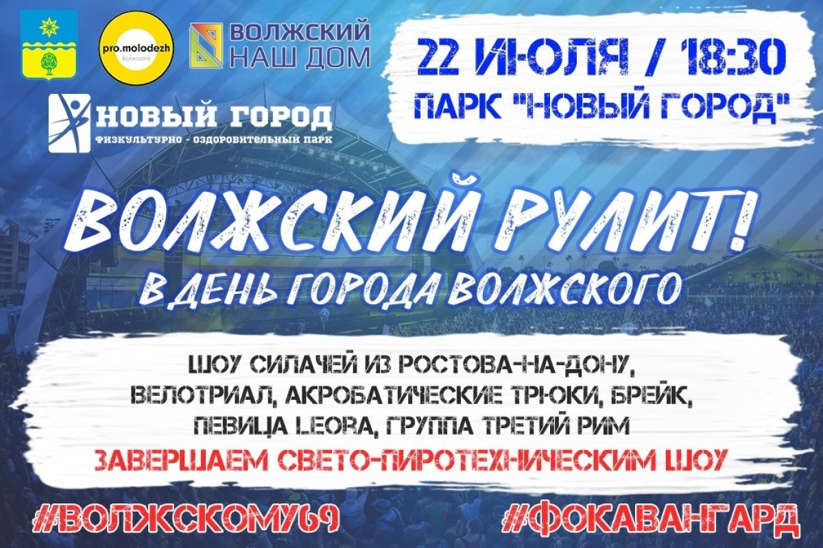 Напомним, празднование Дня города в Волжском продлится с 15 по 23 июля, в программу вошли более 30-ти разноформатных мероприятий – спортивных, культурных, развлекательных и т.д. Они пройдут на пляжах , в парках и на площадях .
