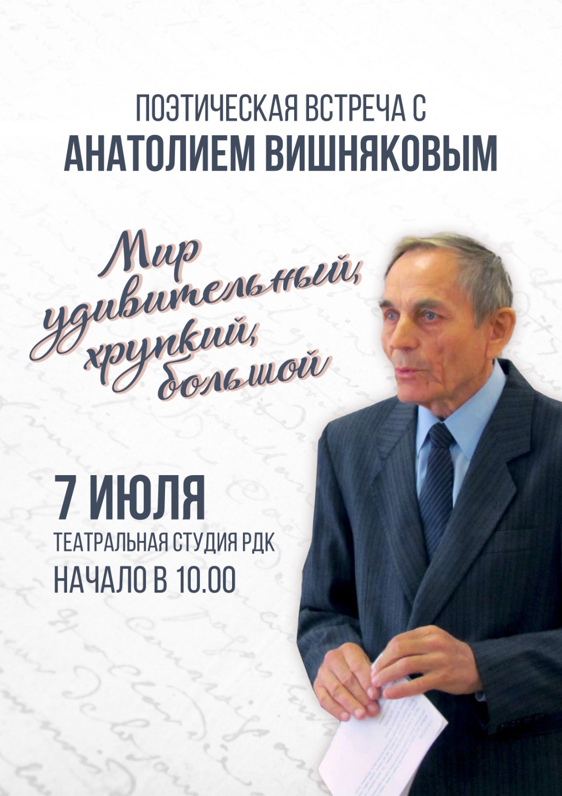 Уважаемые жители и гости района! Приглашаем вас на поэтическую встречу с Анатолием Вишняковым, которая состоится в пятницу, 7 июля,