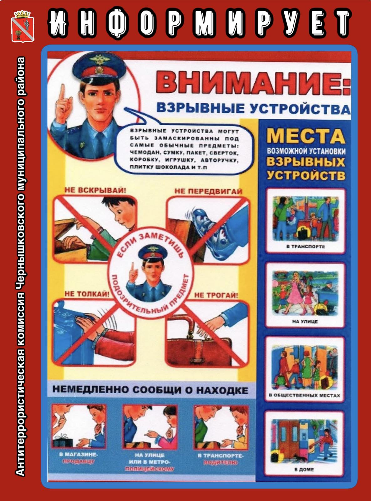 Уважаемые граждане! Будьте осторожны! В транспорте, общественных местах, на улицах террористы могут оставить на первый взгляд обычные предметы (пакеты, книги, игрушки и т.д.), в которых замаскированы взрывчатые вещества.