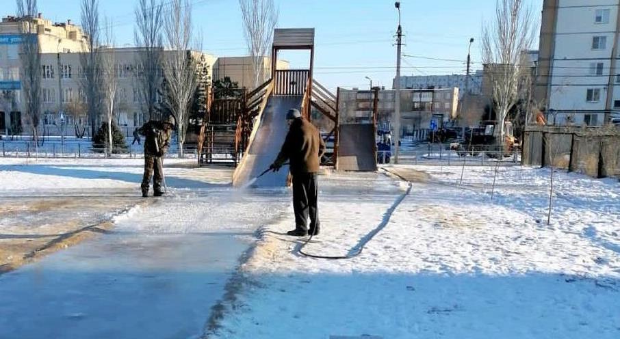 Сегодня в «Космопарке» Волжского сотрудники муниципального учреждения «Современные городские технологии» организовали заливку большой горки.